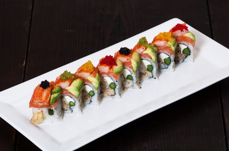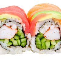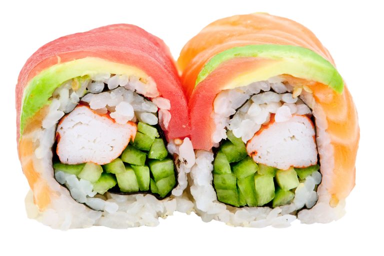 Rainbow roll, 1 pc tuna, 1pc salmon, 1 pc white fish sushi