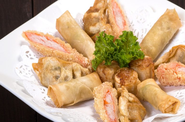 Gyoza, shumai, spring roll, crab stick