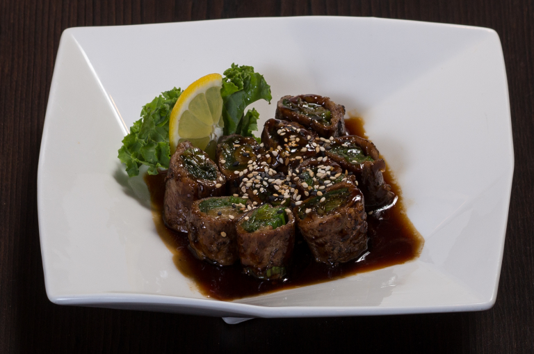 Sliced beef rolled and filled with scallions